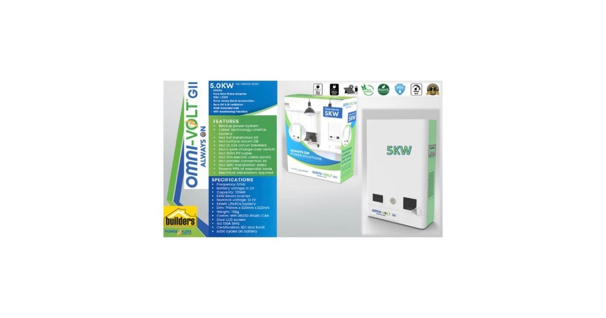 The Power4Less Omnivolt G2 5.0 kW Installation Kit is the complete solution for medium to large homes demanding powerful, uninterrupted power during loadshedding. This high-end system centers around the robust Omnivolt G2 5 kW Pure Sine Wave Hybrid Inverter and a large-capacity 5.12 kWh LiFePO4 Lithium-Ion Phosphate Battery.